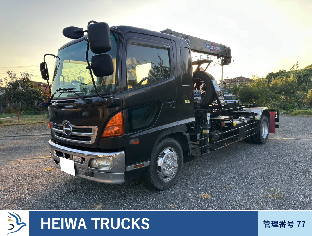 HINOレンジャー クレーン付きアームロール ラジコン付き 新明和 ベッド付き メーター1周 100万キロ超 2人乗り 長さ773cm 幅226cm 高さ296cm ETC FM/AM ラジオ 脱着装置付きコンテナ フロントフォグランプ 最大積載量7100kg 総排気量6400cc