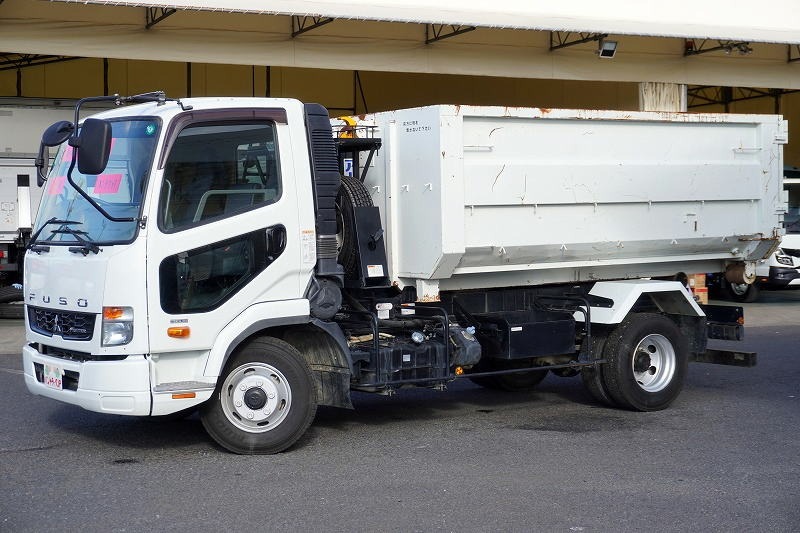 ファイター 4トン 「ベッドレス」 アームロール 新明和製 積載3650kg ツインシリンダー キャブバックステップ コンテナ付き 網工具入れ 坂道発進補助 低走行!6速MT! 車検「R8年5月まで!」